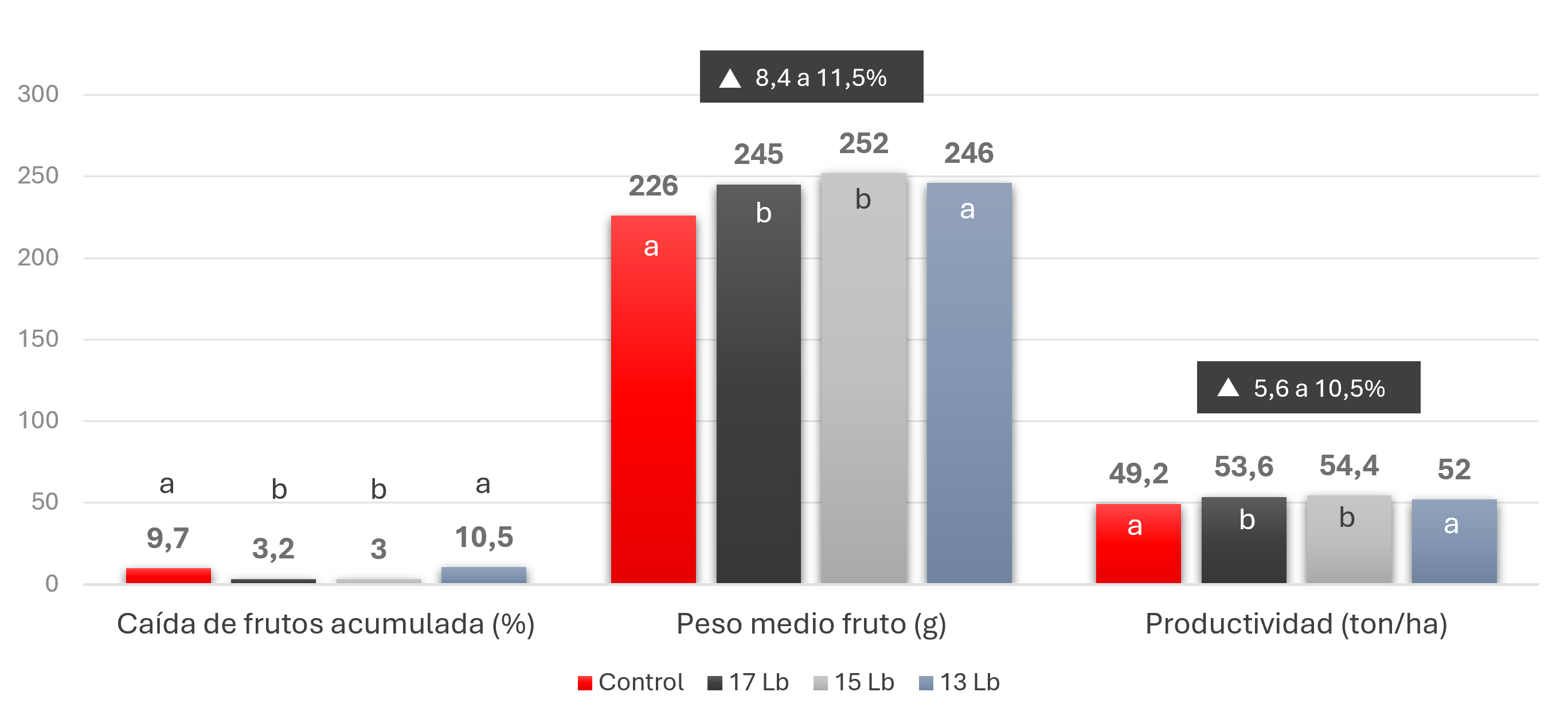 En otras palabras, los tratamientos con ReTain® mostraron mejoras consistentes en rendimiento y calidad. La aplicación en 15 Lb destacó con el mayor peso de fruto, la productividad más alta del ensayo y una mejor distribución de calibres, concentrando una mayor proporción de fruta XL y menos calibres pequeños. En conjunto, estos efectos se traducen en más kilos comercializables, mayor valorización por calibre y un retorno económico superior.