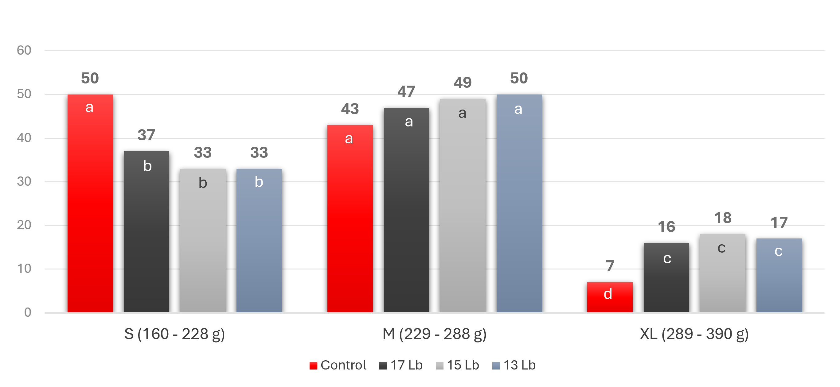 La fruta tratada con ReTain® presentó una mayor proporción de calibres XL y una reducción importante de calibres pequeños (S).
