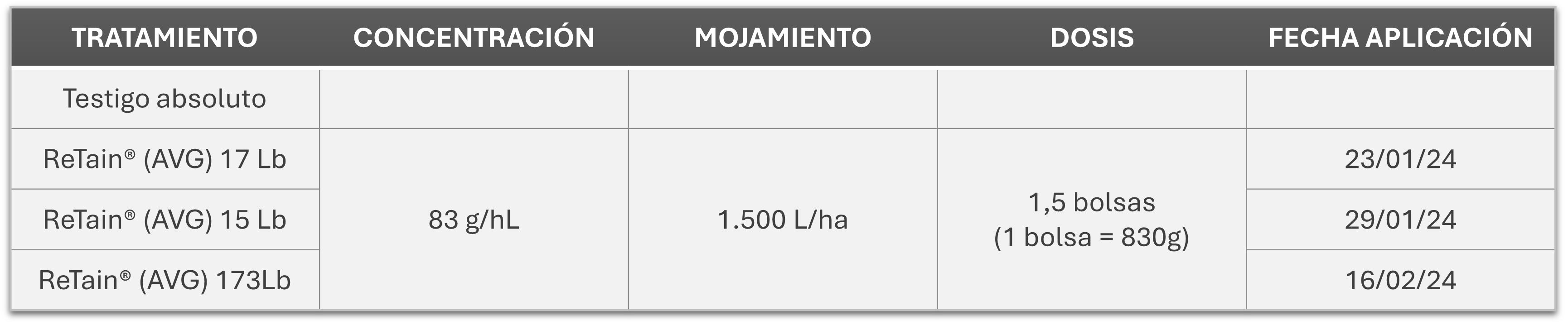 ReTain® previno la caída prematura cuando se aplicó en 17 Lb y 15 Lb. En cambio, la aplicación en 13 Lb no logró controlar la caída, mostrando un comportamiento similar al control.